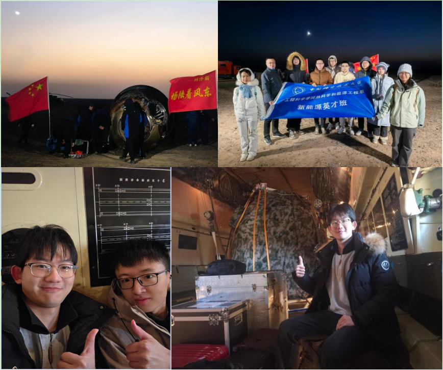 16时40分,神舟二十号航天员乘组乘坐的神舟二十一号载人飞船返回舱在东风着陆场成功着陆。在场人员无不欢呼雀跃地奔向观礼区,鲜艳的五星红旗飘扬在戈壁,与褐色的返回舱一起组成了最美的风景。返回舱舱门打开后,神舟二十号航天员陈冬、陈中瑞、王杰安全顺利出舱,健康状态良好。在现场的掌声和欢呼声中,三名航天员挥手致意,分别进入医监医保车,随后当晚乘机返回北京。在中心领导的关心下,任远和张子昂同学被选中参加了返回舱的护送回京任务,乘坐伊尔76运输机顺利将返回舱交到研究人员手中。至此,师生们亲眼见证了从火箭发射到飞船返回的全过程,真切触摸到祖国航天事业跳动的强劲脉搏。