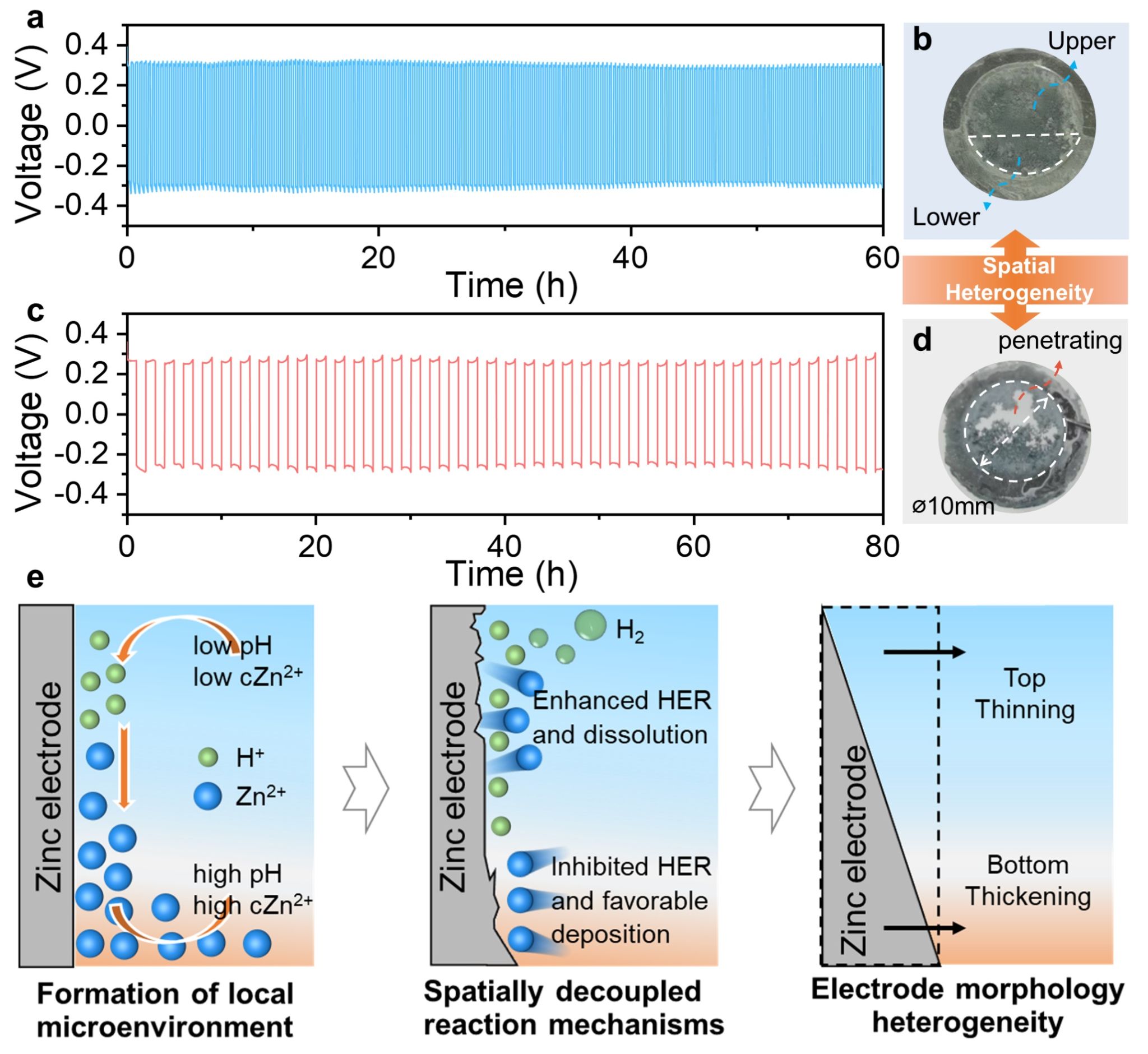 研究团队结合多物理场模拟,系统阐明了这种化学分层是重力耦合物质传输调控的直接结果,并揭示了一个全新的电极失效机制:化学梯度驱动的活性物质再分布。具体而言,上部的低pH和低Zn2+浓度加速了析氢腐蚀和溶解反应,而下部的高pH和高Zn2+浓度抑制了析氢腐蚀,促进了锌沉积。随着循环进行,这种差异驱动活性锌沿竖直方向迁移,最终形成“上部耗尽-下部富集”的结构分化,并引发电极失效。