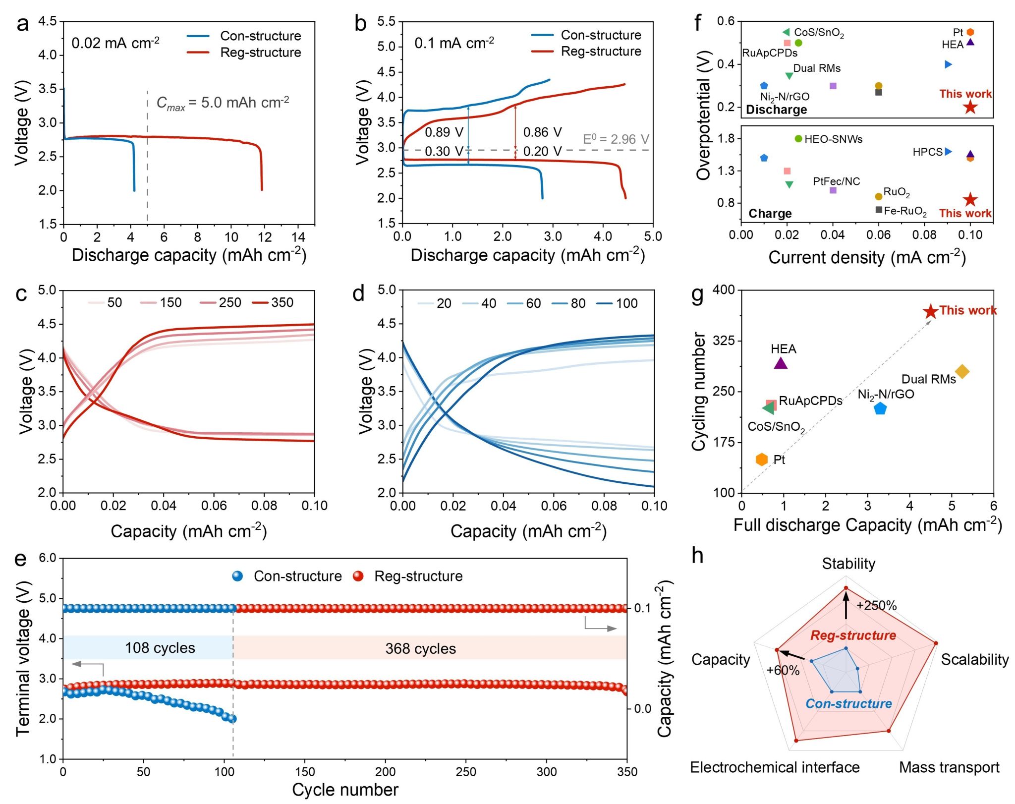 实验结果表明,基于这一结构设计,即使采用常规碳材料构建电极,电池仍表现出优异性能。在0.1 mA cm-2电流密度下,功能区域化结构的全放电容量达到4.46 mAh cm-2,较传统结构提高约60%;放电过电位低至0.2 V,并可稳定循环368次(图2)。结合数学模型与可视化表征,研究团队还进一步揭示了固体产物存储区孔结构对超氧根传输和Li2O2沉积行为的影响规律,为电极结构优化提供了理论依据。