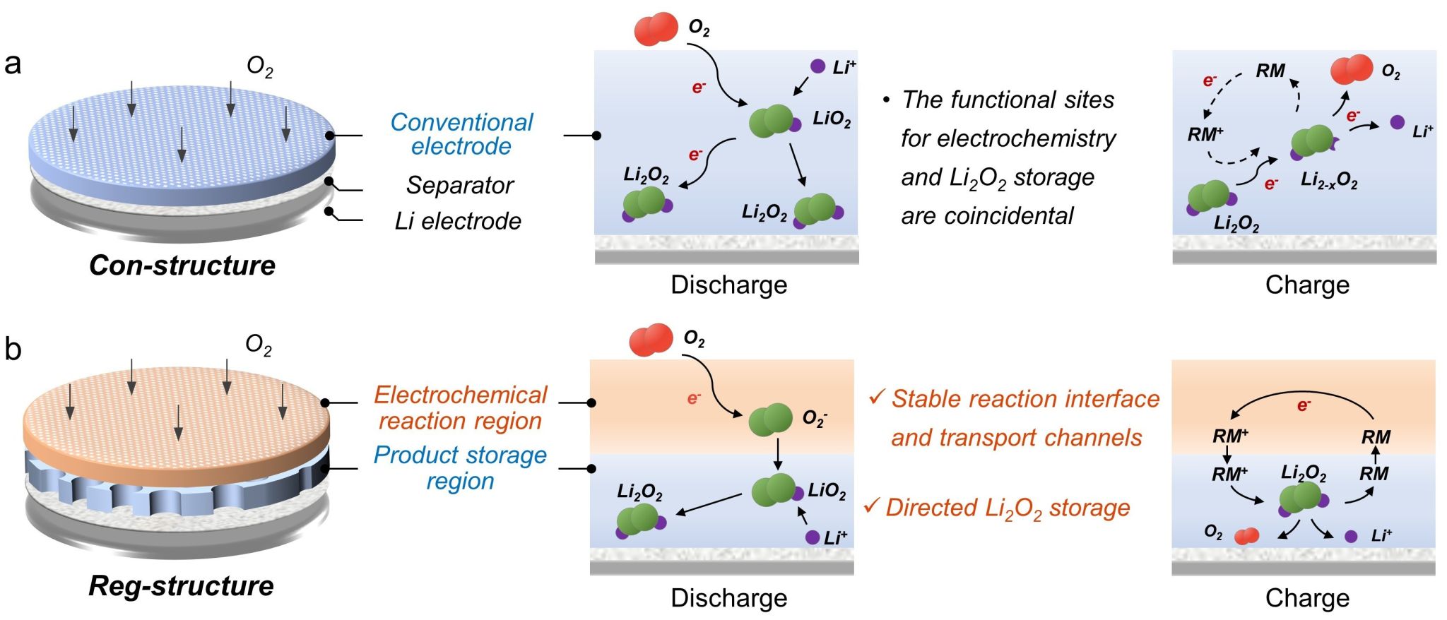 针对这一挑战,研究团队提出功能区域化电极设计思路(图1)。通过调控锂离子浓度分布,将氧单电子还原和Li2O2存储分别锚定在电极的两个区域;中间体超氧根和氧化还原介质(RM)分别作为放电和充电过程中连接两区域的桥梁,实现电子的持续交换以及Li2O2的定向存储与分解。研究表明,约92.7%的Li2O2定向沉积在专门的存储区,使得电化学反应区能够维持低阻力氧气传输和高反应活性,实现氧气和RM的快速转化。与此同时,产物存储区为Li2O2沉积提供充足的附着位点,抑制其团聚,从而保持与RM较高的反应接触面积。